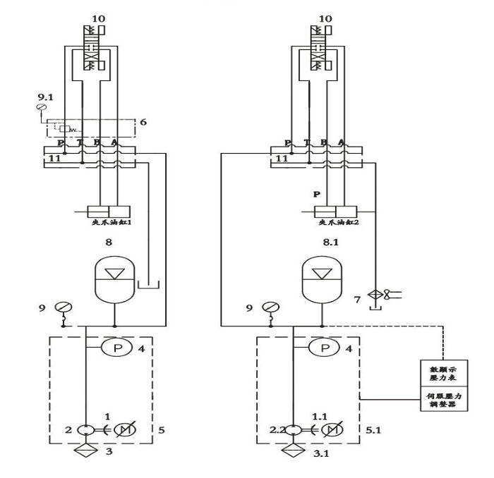 伺服液压站采用压力与速度闭环控制0-10V高精度的压力传感器,通过伺服驱动器精确调控,使油压波动稳定在+-1(kg/cm²)以内。